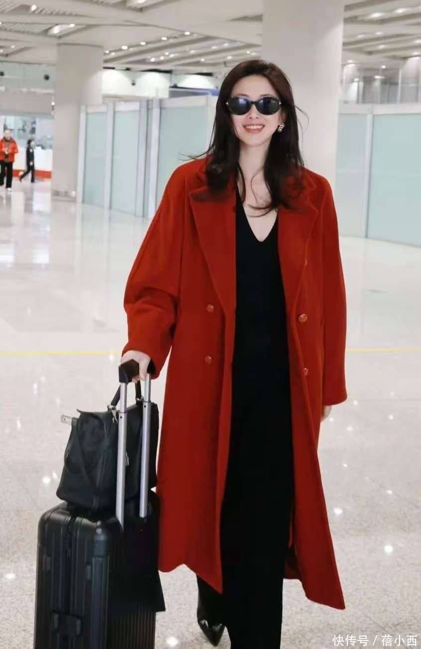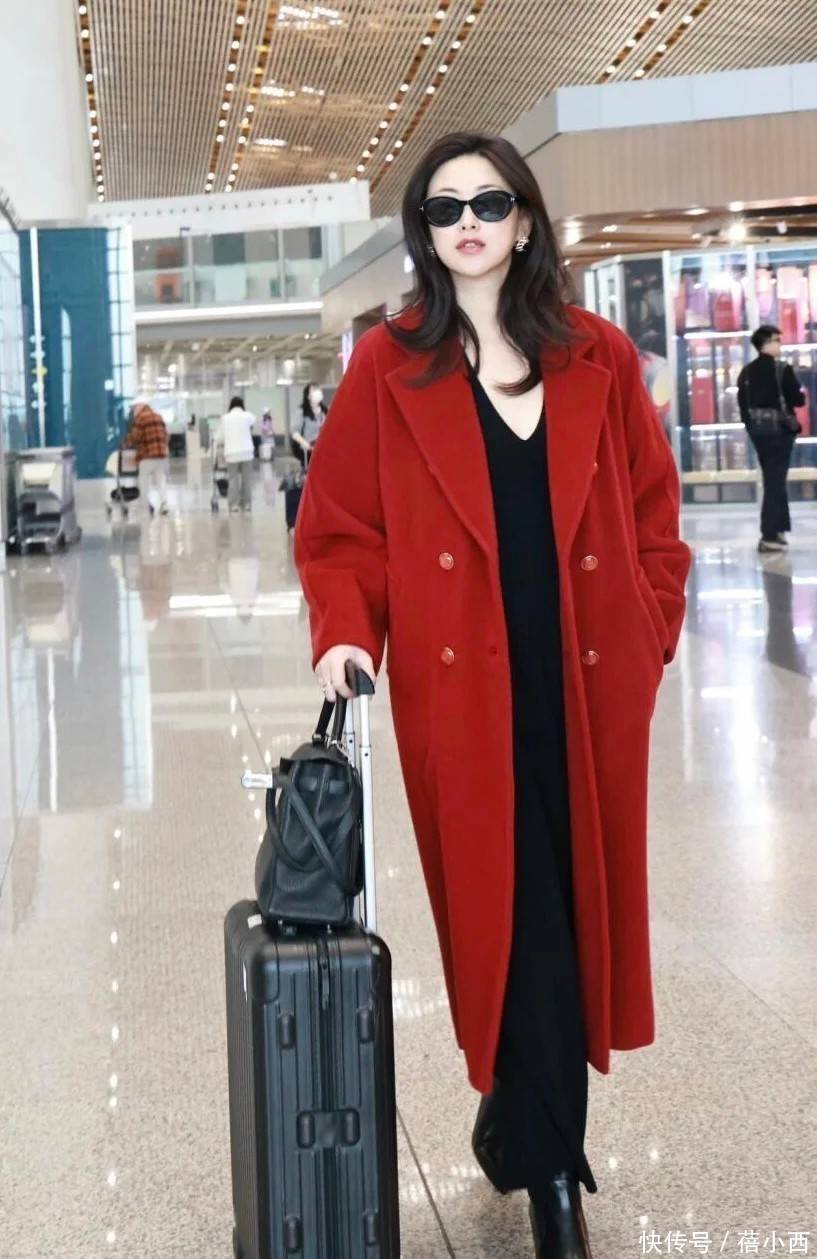 由于红大衣是中长款设计,因此可驾驭的人群有所减少,更为适合一米六以上的姐妹。高个女生在穿中长款大衣时,内搭可能直接会选一件连衣裙,朱珠就是这么做的。里边是黑色裙子,领口看上是V型,凸显脖长的同时人也看着更干练了。