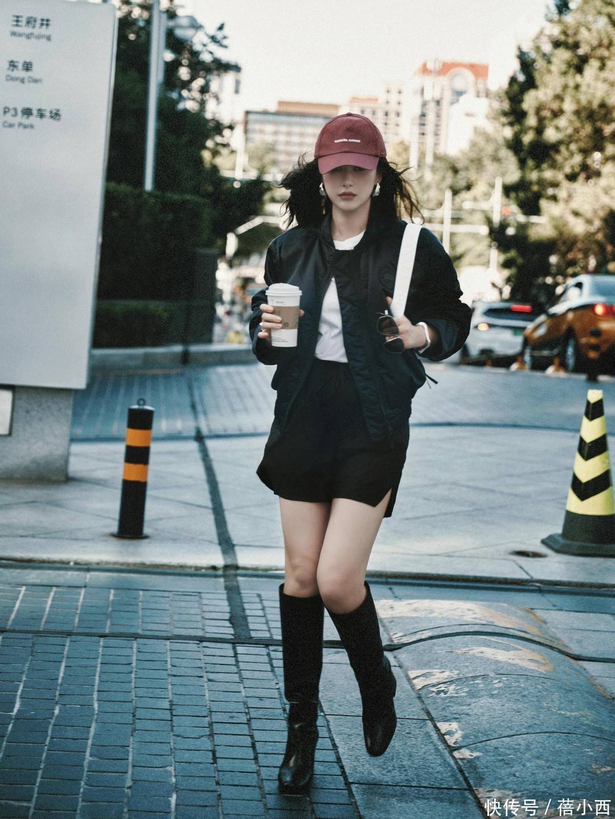 按照大部分人的思维,当外套是薄款、腿上单穿短裤时,脚上基本不会选择长筒靴。因为脚以上的搭配让人觉得温度大概有20多度了,可长筒靴哪怕不加绒,其保暖性也比常规的休闲鞋高出一大截。因此,这身穿搭适合拍写真时穿。
