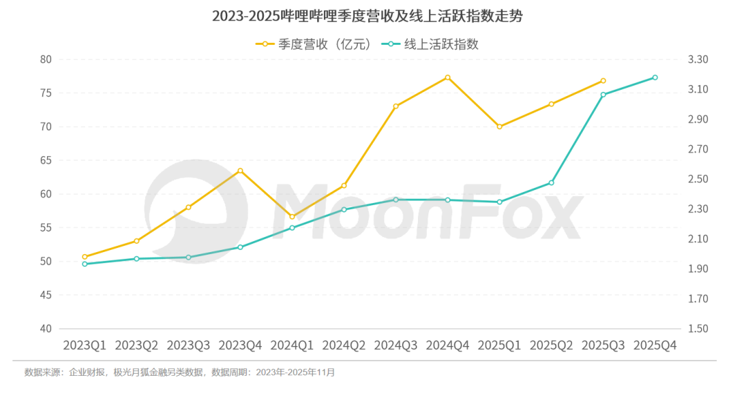 极光月狐金融另类数据显示,伴随线上活跃指数的稳定上升,B站的季度营收也呈增长态势。