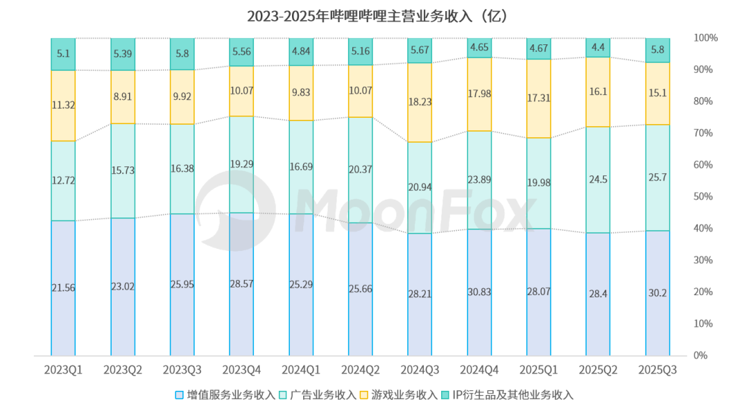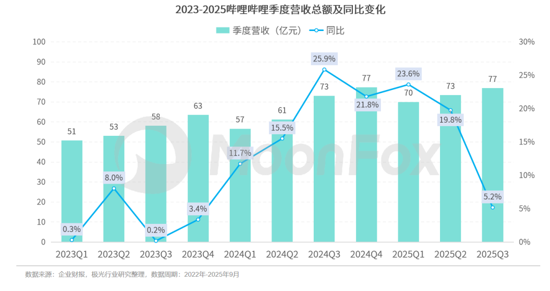 2025年Q3,哔哩哔哩总营收同比增长5.2%,达到76.9亿元。2024年三季度实现单季盈利以来,B站单季营收表现较为稳定,2025年同比增速逐季放缓。