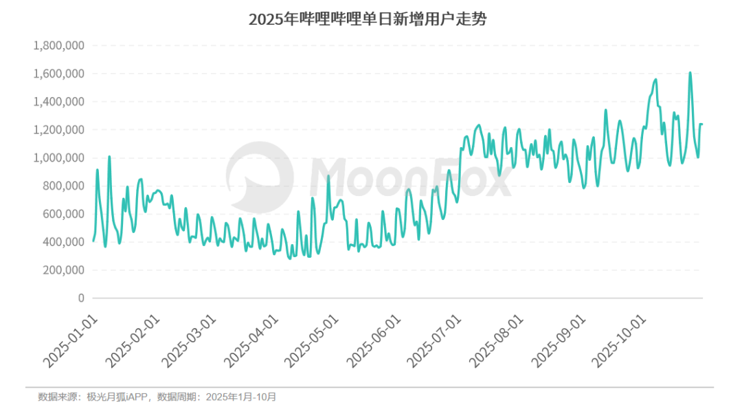 内容创新、游戏新品加速社区扩张,极光月狐iAPP数据显示,下半年B站单日新增用户数量显著高于上半年,10月更是刷新全年最高值。